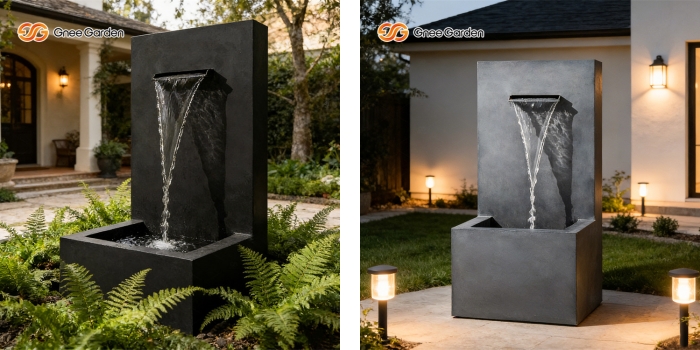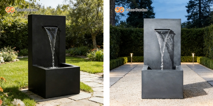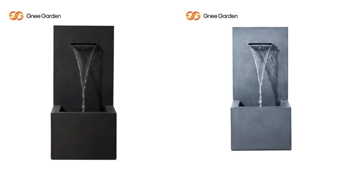 Each water feature is crafted from premium, rust-resistant metal with finishes that are engineered to maintain their beauty throughout the year. The matte black finish adds a bold, contemporary contrast to greenery and stone, while the natural grey option complements neutral, organic outdoor color schemes.
