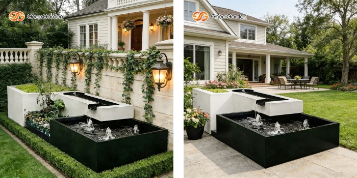 Crafted from premium weather-resistant metal, the Modern Outdoor Metal Fountain with Planter presents a bold two-tier structure. A sleek upper channel cascades water into a deep black-coated lower basin, fitted with built-in bubbler jets to generate mild, peaceful water motion.