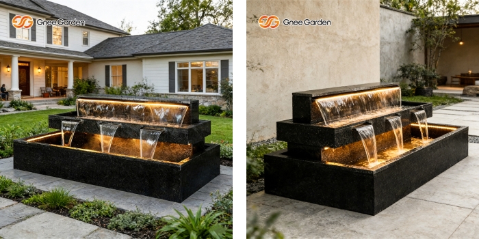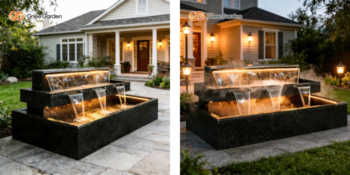 Designed to transform any outdoor area into a tranquil retreat, this fountain is a perfect addition to your garden. Its sleek, multi-level waterfall design, paired with integrated LED lighting, creates a calming focal point that shines both day and night, blending modern aesthetics with natural tranquility.